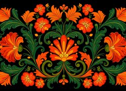 Khokhloma z czerwonych kwiatów i zielonych liści w grafice