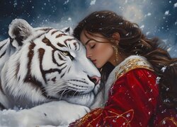 Kobieta w czerwonym płaszczu z białym tygrysem