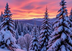 Kolorowe niebo zachodzącego słońca nad ośnieżonymi drzewami