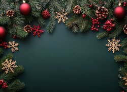 Kompozycja z czerwonych bombek szyszek i jagód wśród gałązek świerkowych