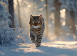 Kot idący po śniegu w zimowym lesie