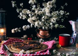 Kwitnące gałązki drzewa owocowego obok florentynek