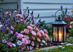 Lampion z zapaloną świecą obok różowych kwiatów w ogrodzie