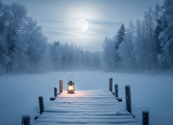 Latarnia na ośnieżonym pomoście nad jeziorem