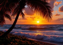 Liście palmy i fale na tle zachodu słońca nad morzem