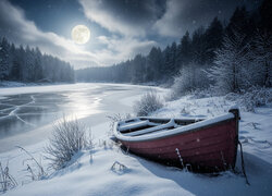 Łódka na brzegu zamarzniętej rzeki w księżycowym blasku