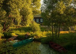 Łódka na stawie obok pomostu