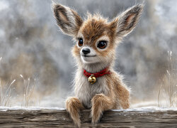 Mały renifer z dzwoneczkiem oparty o ośnieżoną deskę
