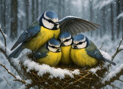 Modraszka zwyczajna z pisklętami w ośnieżonym gniazdku
