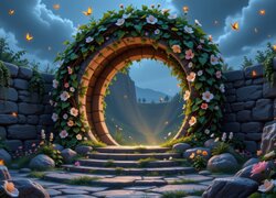 Murowane koło udekorowane pnącymi różowymi kwiatami