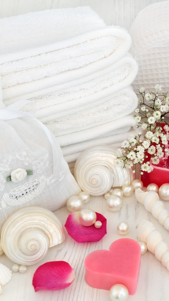 Muszelki i perły obok ręczników