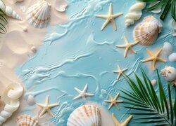 Muszelki i rozgwiazdy oraz zielone liście na niebieskim tle