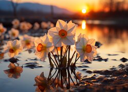 Narcyzy w wodzie na tle zachodu słońca