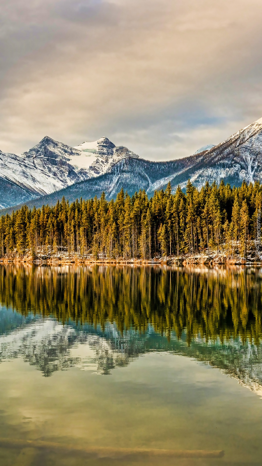 Odbicie lasu i ośnieżonych gór w jeziorze