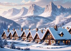 Ośnieżone domy i drzewa u podnóża gór