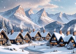Ośnieżone domy w wiosce u podnóża gór w zimowej scenerii