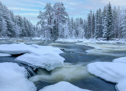 Ośnieżone drzewa i ośnieżony lód na rzece w zimowej scenerii