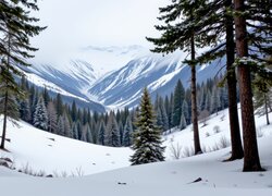 Ośnieżone drzewa iglaste i góry w oddali