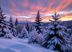 Ośnieżone drzewa na zboczu o wschodzie słońca