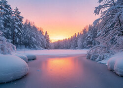 Ośnieżone drzewa nad zamarzniętą rzeką o wschodzie słońca