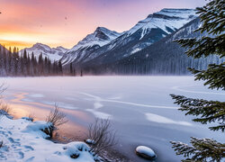 Ośnieżone drzewa nad zamarzniętym jeziorem w górach