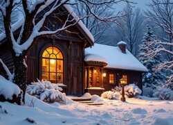 Ośnieżone drzewa przed oświetlonym domem