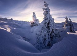 Ośnieżone drzewa w zaspach i promieniach słońca