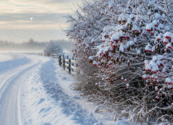 Ośnieżone krzewy i ogrodzenie przy zaśnieżonej drodze