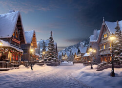 Oświetlone i udekorowane świątecznie domy przy zaśnieżonej ulicy