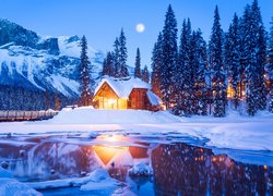 Oświetlony dom nad jeziorem Emerald Lake
