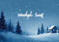 Oświetlony domek i ośnieżone drzewa w zimowej scenerii
