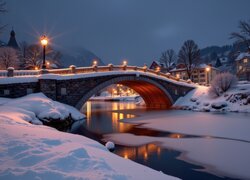 Oświetlony latarniami ośnieżony most nad rzeką nocną porą