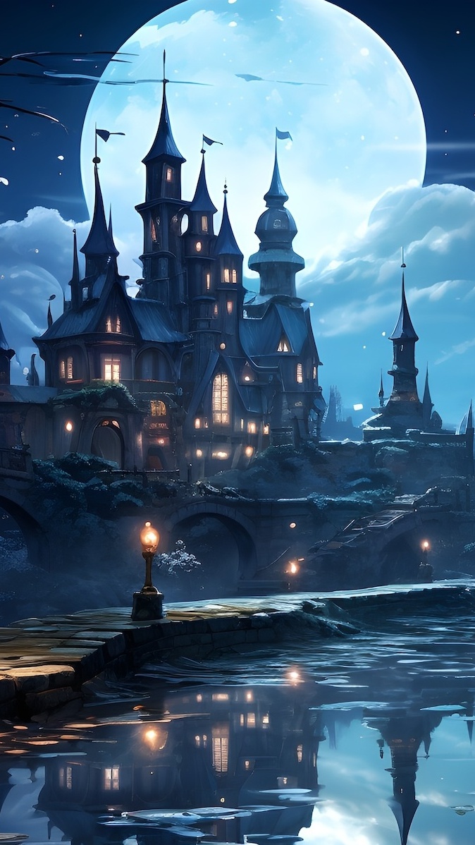 Oświetlony nocą zamek nad stawem na tle księżyca w pełni