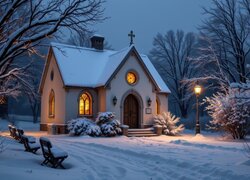 Oświetlony od wewnątrz kościółek w zimowej scenerii
