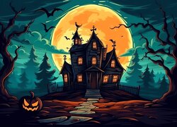Oświetlony stary dom na tle księżyca w halloweenowej grafice