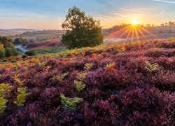 Paprocie i drzewo na wrzosowisku w Parku Narodowym New Forest w Anglii