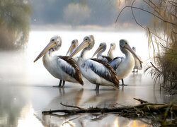 Pelikany na zamglonym jeziorze