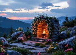 Płonący znicz i pnące kwiaty na murowanej kapliczce