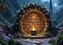 Płonący znicz przed murowaną budowlą otoczoną pnącymi kwiatami
