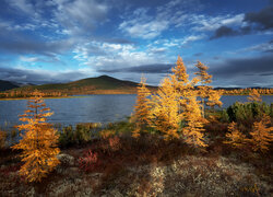 Pożółkłe drzewa nad jeziorem Jack London na Kołymie