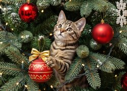 Pręgowany kot i bombka wśród świerkowych gałązek na choince