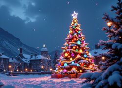Prezenty na śniegu pod udekorowaną choinką z gwiazdą