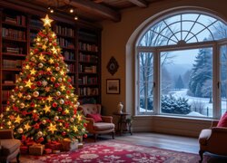 Prezenty pod udekorowaną choinką obok regału z książkami