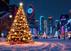 Prezenty pod udekorowaną choinką przy zaśnieżonej ulicy