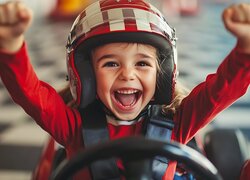 Radosne dziecko w kasku za kierownicą