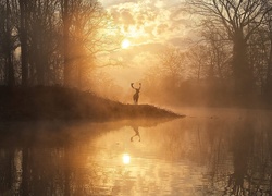 Rogacz we mgle nad rzeką