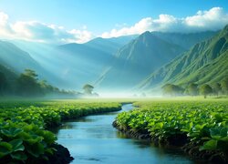 Rośliny po obu stronach rzeki w dolinie i góry w oddali