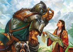 Rozmowa kobiety trzymającej rybę z wojownikiem
