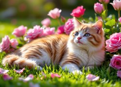 Rudo-biały kot leżący na trawie obok różowych kwiatów