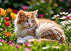 Rudo-biały kot leżący na trawie w ogrodzie